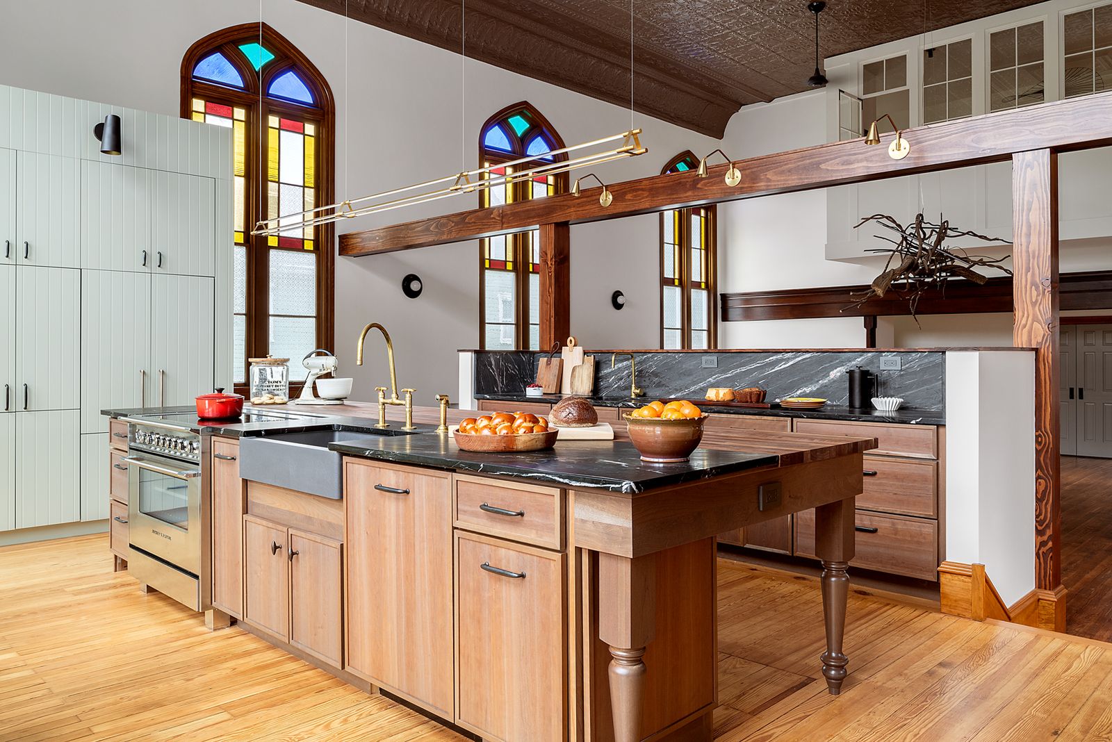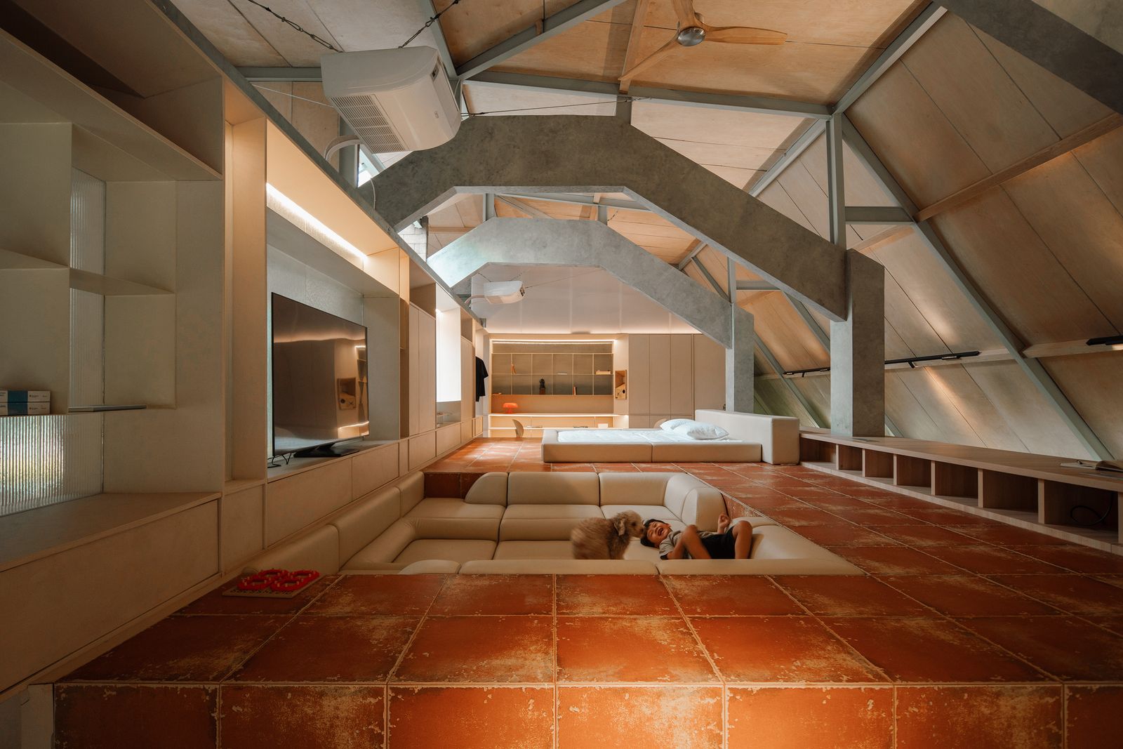 Exposed concrete trusses, birch plywood ceilings, and an open-plan make it feel grand but not gaudy.