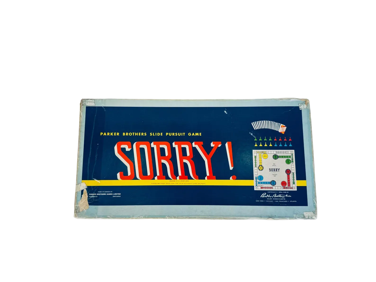 A true mid-century classic from Parker Brothers’ Toronto studio, this 1950s "Sorry!" edition pairs sleek modernist graphics with bright primary playing pieces and a textured navy box. Complete with its original cards, rule sheet, and bold typography, it’s a nostalgic collectible or ready-to-play piece of family history.